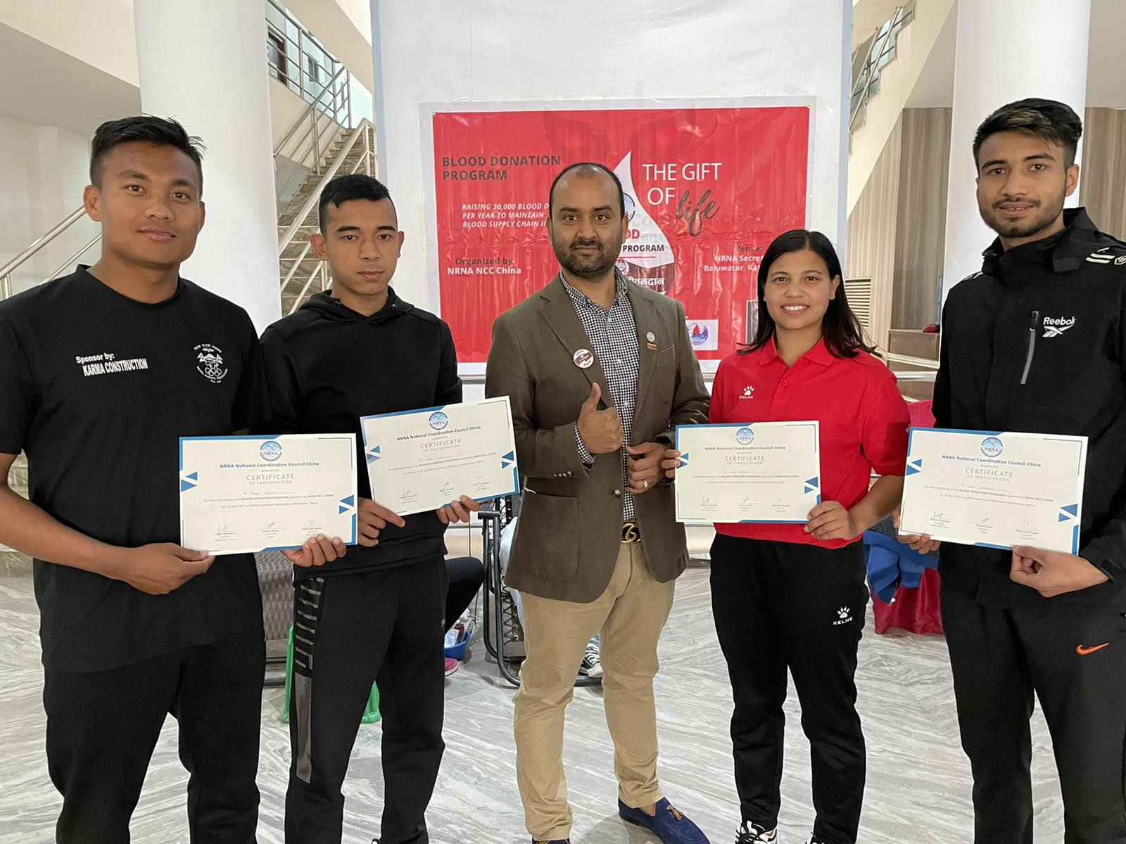 गैरआवसीय नेपाली संघ राष्ट्रिय समन्वय परिषद चीनका अध्यक्ष प्रदीप न्यौपाने, एनसिसि चीनका पदाधिकारीहरु, संरक्षकहरु, गैरआवासीय नेपाली संघ मानार्थ परिषद् सदस्य विनोद भट्टराई, खेलकुद प्रतिष्ठानका सदस्य सचिव धर्मराज गिरी, ओलम्पियन दिपक विष्ट र निशा रावल, सार्क गेमका स्वर्ण पदक विजेता आयशा शाक्य र मण्डेकाजी श्रेष्ठ, खेलकुद प्रतिष्ठानका पदाधिकारीहरु लगायत गैरआवासीय नेपालीहरुले रक्तदान गर्नु भएको थियो ।