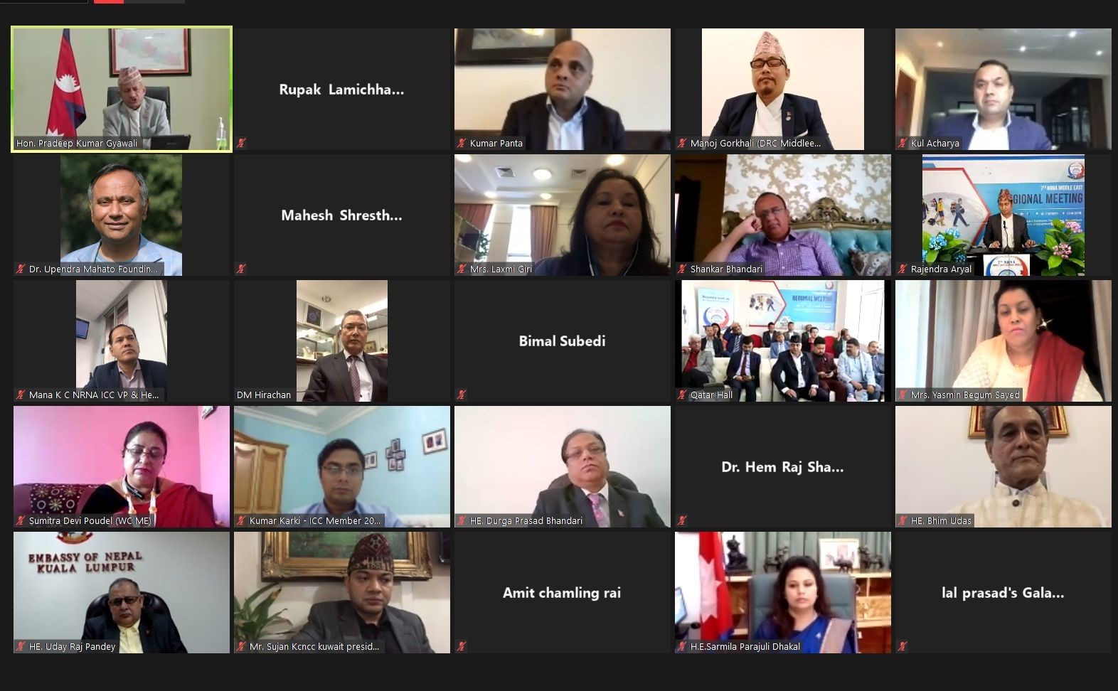 “गैरआवासीय नेपालीहरूको आजको आवस्यकता स्वास्थ्य सुरक्षा, सहज फिर्ती एवं रोजगारी, सामाजिक पुर्न:स्थापनाको सुनिश्चिता” (Necessity of Migrant Nepalese, Healthcare, Easy Return and Employment, Social Rehabilitation.) भन्ने मुल विषयका साथ शुरु भएको गैरआवासीय नेपाली संघ मध्यपूर्व क्षेत्रीय भेला एवं बैठक अक्टुबर १६ र १७ मा भर्चुअल अनलाईन मार्फत सहभागीहरुको गरिमामय सहभागीताले सम्पन्न भएको छ।