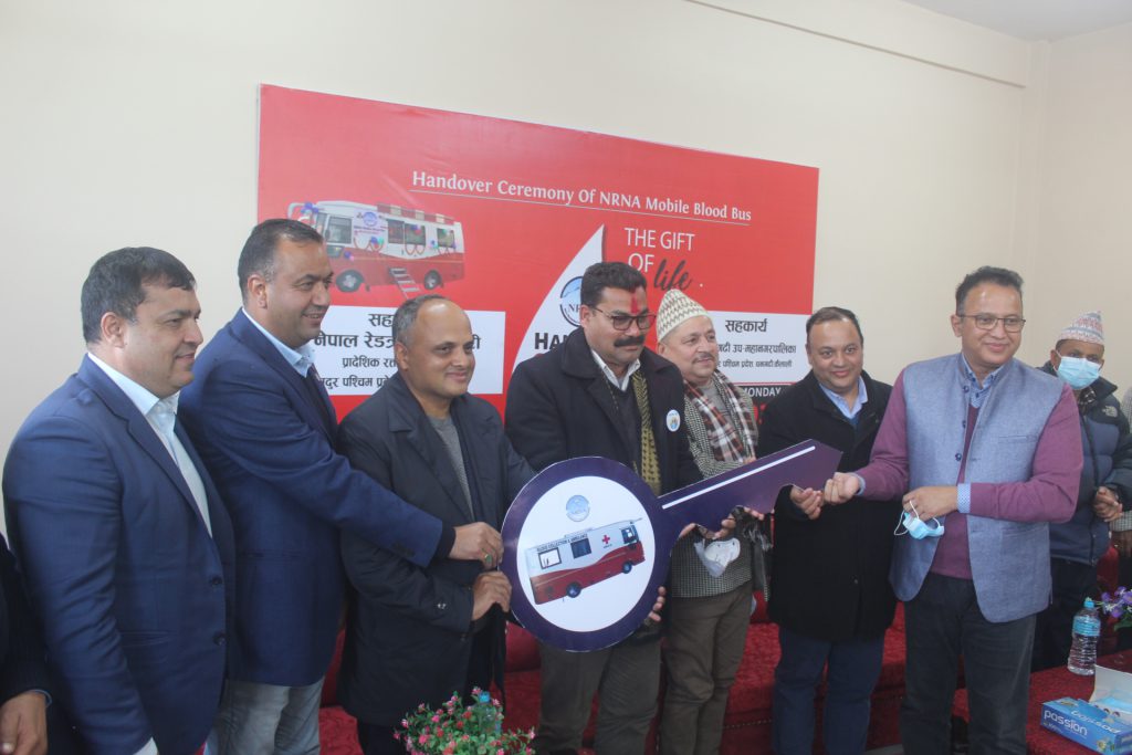गैरआवासीय नेपाली संघ (एनआरएनए) ले सुदुरपश्चिम प्रदेशलाई ‘मोबाइल ब्लड बैंक बस’ सहयोग गरेको छ । धनगढीमा सोमबार आयोजित एक कार्यत्रममा संघका अध्यक्ष कुमार पन्तले धनगढी उपमहानगरपालिकाका मेयर नृप ओडमार्फत कैलाली रेडक्रसका अध्यक्ष उत्तम जोशीलाई सो बस हस्तान्तरण गर्नुभएको हो । सो अवसरमा अवसरमा एनआरएनएका संरक्षक जीवा लामिछाने, उपाध्यक्ष डा बद्री केसी, महासचिव डा. हेम राज शर्मा, प्रवक्ता डिवी क्षेत्री, मानार्थ सदस्य धर्मराज अधिकारी, शनिकुमार ओली र सल्लाहकार कुल आचार्य, लगायत एनआरएन अभियन्ताहरु सहभागी हुनुहुन्थ्यो ।